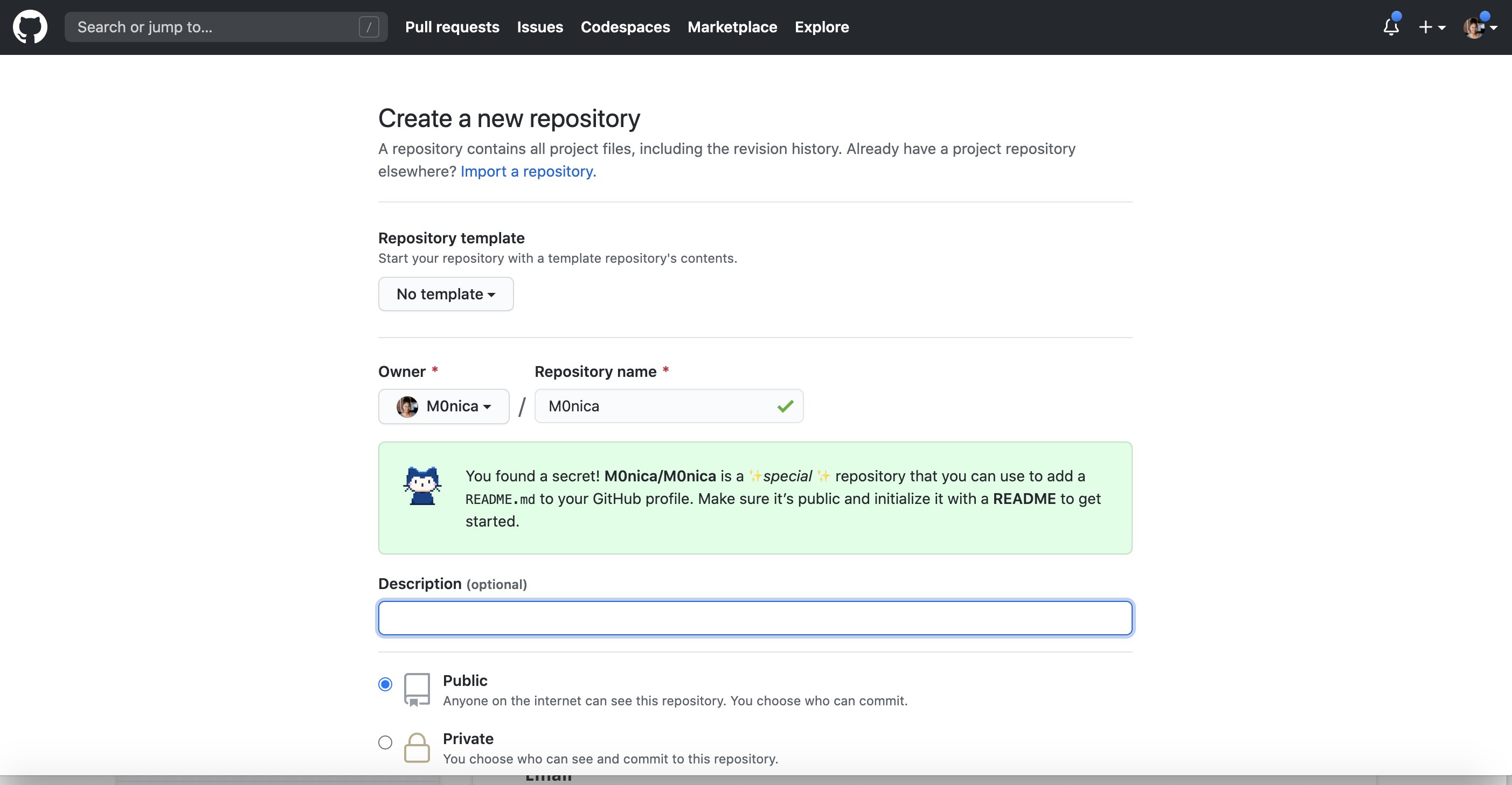 The profile README is created by creating a new repository that’s the same name as your username. For example, my GitHub username is m0nica so I created a new repository with the name m0nica. Note: at the time of this writing, in order to access the profile README feature, the letter-casing must match your GitHub username.
