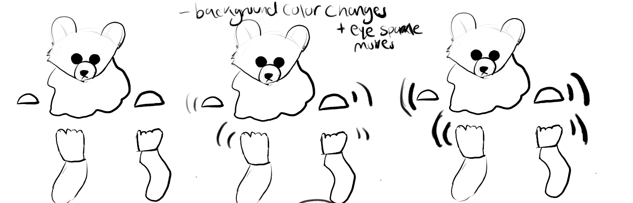 a rough sketch showing how the eyes and water should change over time with the animation along with a note indicating the background color will shift as well