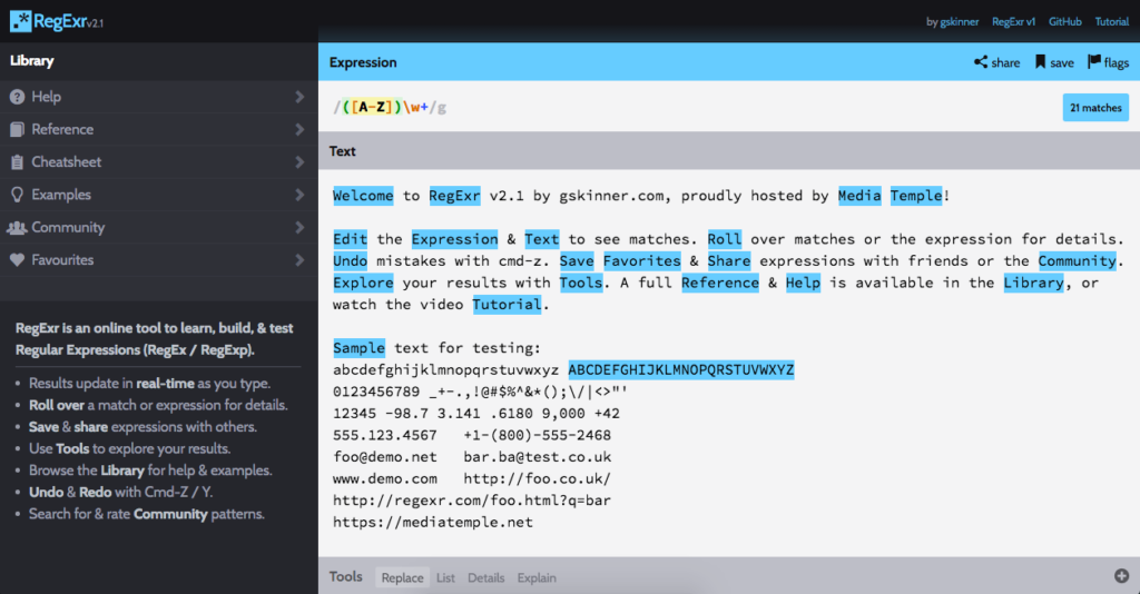 I recently discovered RegExr as I was learning how to use regular expressions in Python. You can check out my notes (iPython notebook) on Regular Expressions here. You can edit the text, adjust the regular expression and see the results update in real-time. Additionally, everything that that the RegEx captures is annotated and shows you which part of the RegEx selected a specific characters.